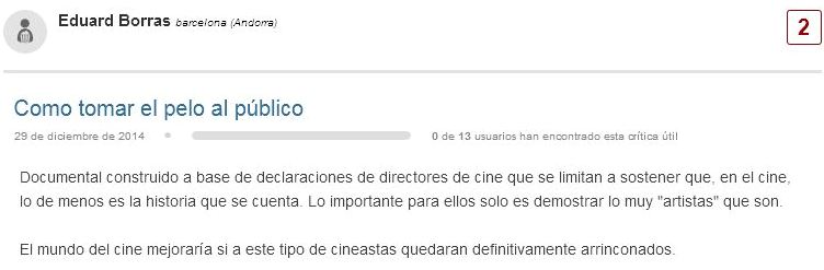 Personalmente no me ha entretenido ni una pizca, digamos que hay un gran numero de directores que no son conocidos (al menos para una servidora) y algunos son de lo más raros. Si algo he sacado en claro tras su visualización, es la cantidad de gente rara e insólita que existe alrededor del cine, me encanta ver documentales de cine pero este definitivamente no es para mí.